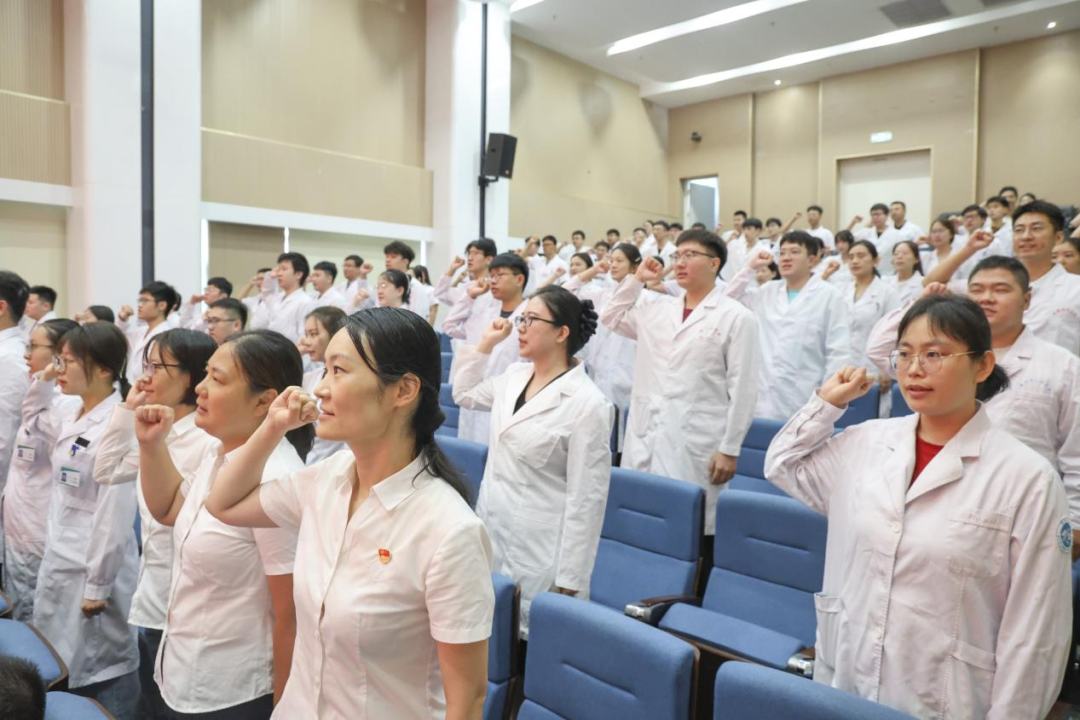 全体2025级住培医师肃然起立,高举右手,庄严宣读《中国医师誓言》:“我志愿献身人类的健康事业,自觉维护医学的尊严和神圣……”洪亮而坚定的誓言响彻会场,“健康所系,性命相托”的庄重承诺深深烙印在每一位新医师心中,表达了他们恪守医德、精研医术、为保障人民健康事业奋斗终身的坚定信念。