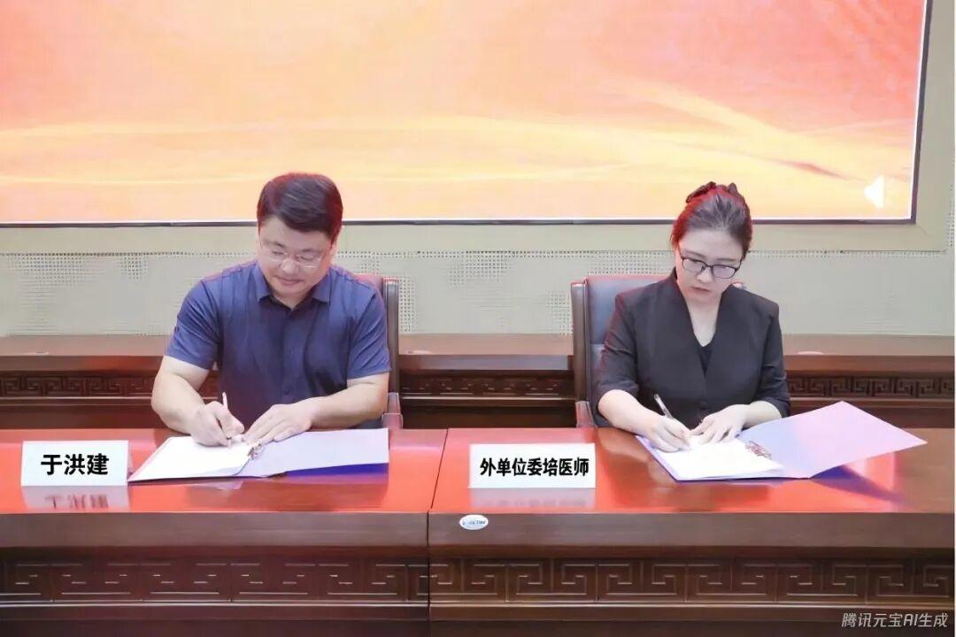 典礼进入庄严的培训协议签订环节。党委委员、副院长于洪建代表医院,先后与社会化住培医师代表杨明宇医师,以及外单位委培住培医师代表、王琼医师,郑重签订了《住院医师规范化培训协议》。
