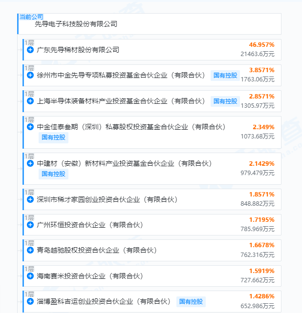 天眼查显示,先导稀材持有先导电科46.957%的股份,而先导电科的其他股东包含中金资本、比亚迪、东方电气,以及合肥、徐州、珠海等地方国资旗下公司。