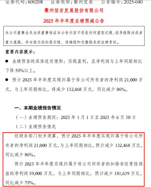 7月15日,衢州发展公告称,公司预计2025年上半年的归母净利润为2.1亿元,同比下降86%;扣非后净利润为5.9亿元,同比下降75%。